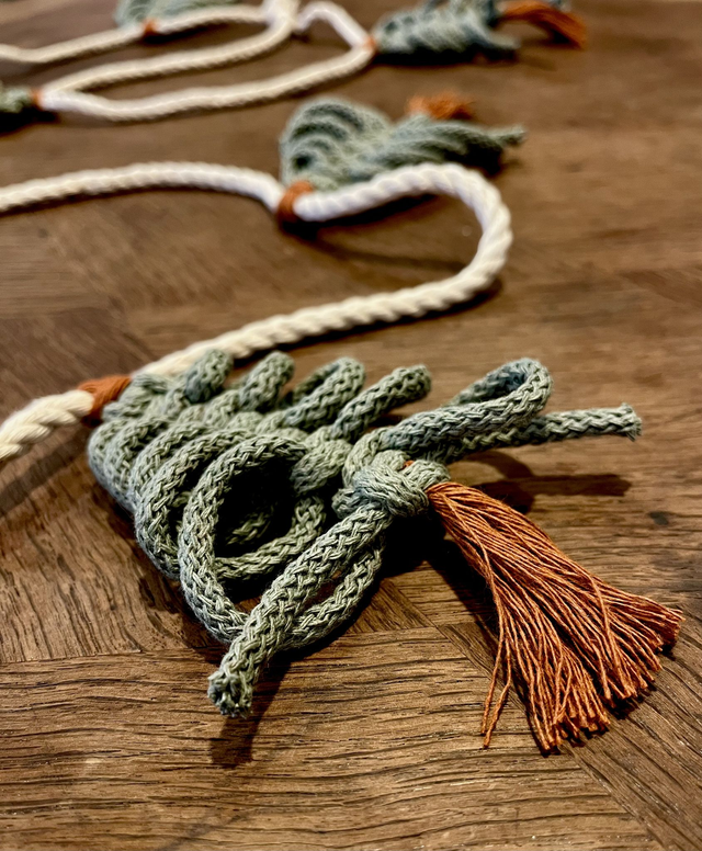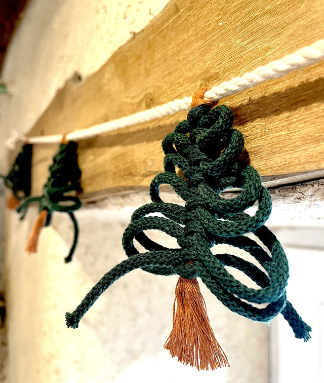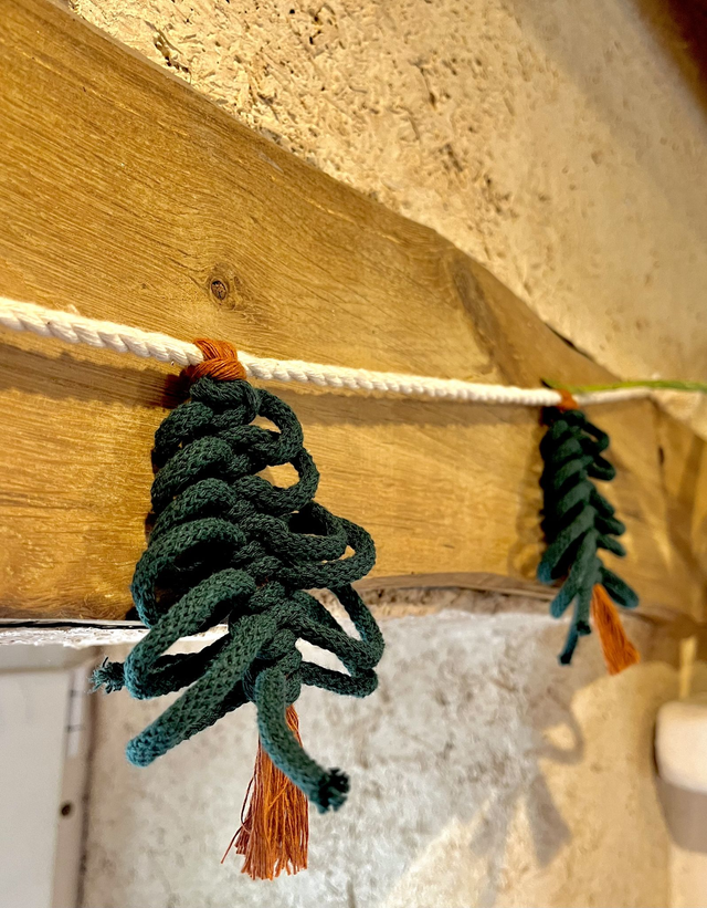 Ces guirlandes sont composées de petits sapins réalisés en corde de coton recyclé. Chaque élément est fabriqué et assemblé à la main dans mon atelier en Haute-Garonne.