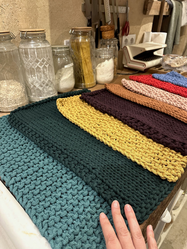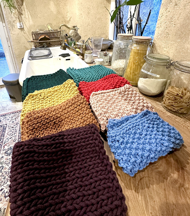 Entièrement tricotés à la main en corde de coton recyclée, pour une cuisine plus belle, plus saine et zéro déchet ♻️.